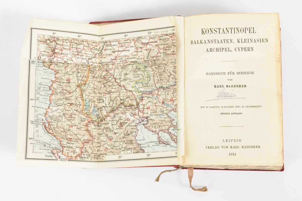 "Konstantinopel, Balkanstaaten, Kleinasien, Archipel, Cypern - Handbuch für Reisende", 2. Auflage mit Karten, Plänen und Grundrissen. 484 Seiten. Roter Leineneinband. Altersgemäßer guter Zustand.
