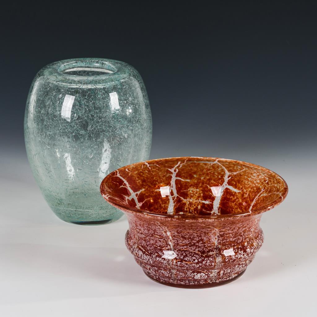 1x sogenanntes "Dexel-Ei", Entwurf von Walter Dexel, um 1937: ovoide Vase aus farblosem Schaumglas mit türkisfarbenen, netzartigen Oxideinschmelzungen in der Zwischenschicht (H 17,5 cm). / 1x Kraterschale aus farblosem Glas mit opalorangenen und silbrig-weißen Kröseleinschmelzungen (H 9 cm).