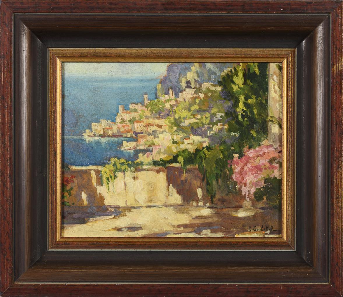 Blick von einer Terrasse mit blühenden Pflanzen entlang der Küste mit den dicht stehenden Häusern. Leichte Altersspuren.