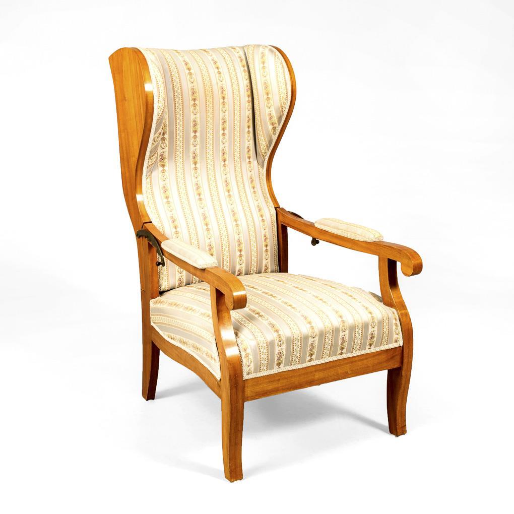 Armlehnsessel mit 3-fach verstellbarer Rückenlehne, Ohrenbacken-Polsterteilen und volutierten Armlehnen, auf 4 dezent geschwungenen Beinen; Polster mit hell-gestreiftem Bezug und Blumenmuster. Restauriert, Polster und Bezug ergänzt.