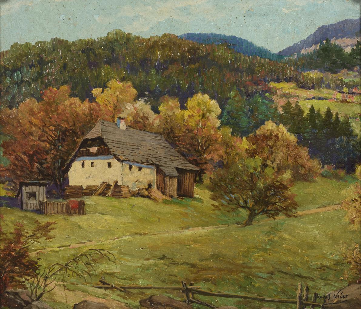 Bauernhaus am Hang unterhalb des Berges zwischen herbstlich gefärbten Bäumen.
