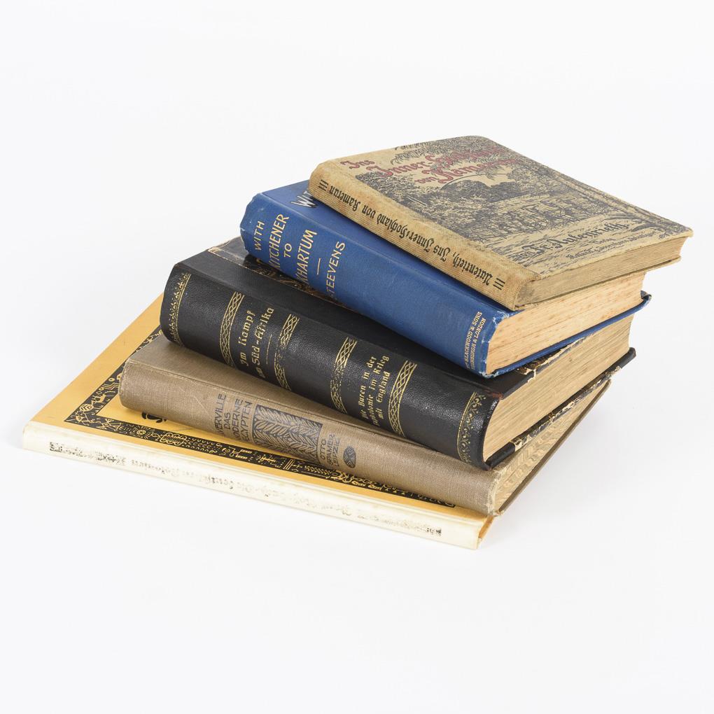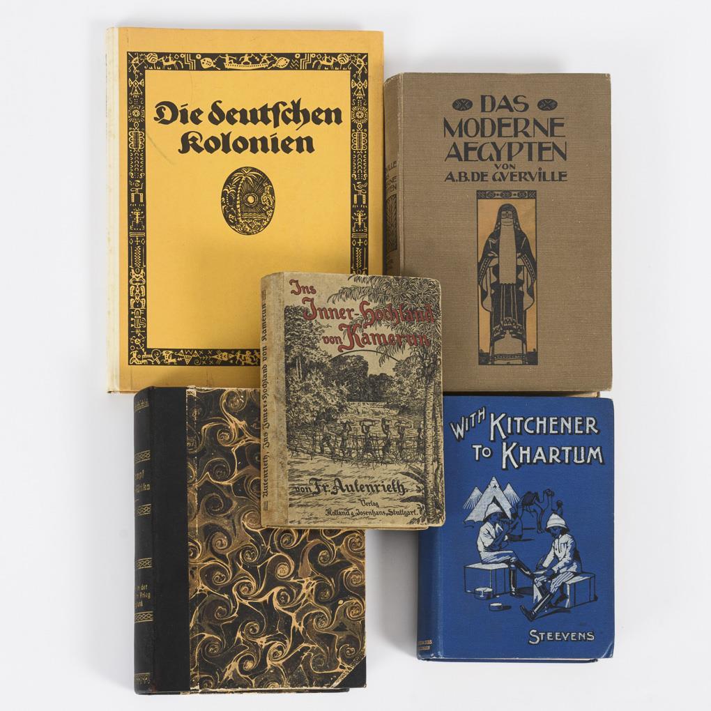 Autenrieth: "Ins Innere Hochland von Kamerun - eigene Reiseerlebnisse", Stuttgart (1913), 189 Seiten. Mit Widmung des Verfassers. Halbleineneinband, 18,5 x 13 cm. / Steevens: "With Kitchener to Khartum", Edinburgh u. London 1898, 9. Auflage. 326 Seiten, Leineneinband, 19,5 x 14 cm. / "Die Buren in der Kapkolonie im Krieg mit England" Herausgeber Schowalter, München o.J., 293 Seiten. Halbleineneinband, 22 x 15,5 cm. / Rohrbach: "Die deutschen Kolonien - Ein Bilderbuch aller deutschen Kolonien ...", Dachau o.J., 84 Seiten, Halbpergamenteinband, 27,5 x 20,5 cm. / de Guerville: "Das moderne Aegypten", Leipzig 1906, 368 Seiten, Leineneinband, 23,5 x 16,5 cm. Alle Bücher illustriert oder mit Kartenmaterial. Leichte Gebrauchsspuren.