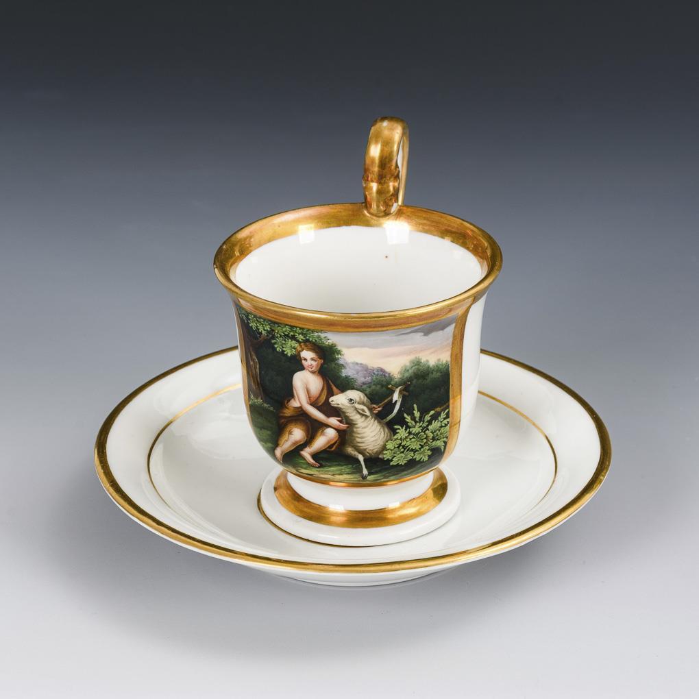 Gefußte Glockentasse mit Schwanenhalshenkel. Schauseitig eine goldgerahmte Rechteckkartusche mit der Darstellung des in einer Landschaft sitzenden Johannes des Täufers als Kind (Ecce Agnus dei). Kurzer Haarriss am Mündungsrand.