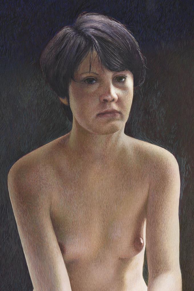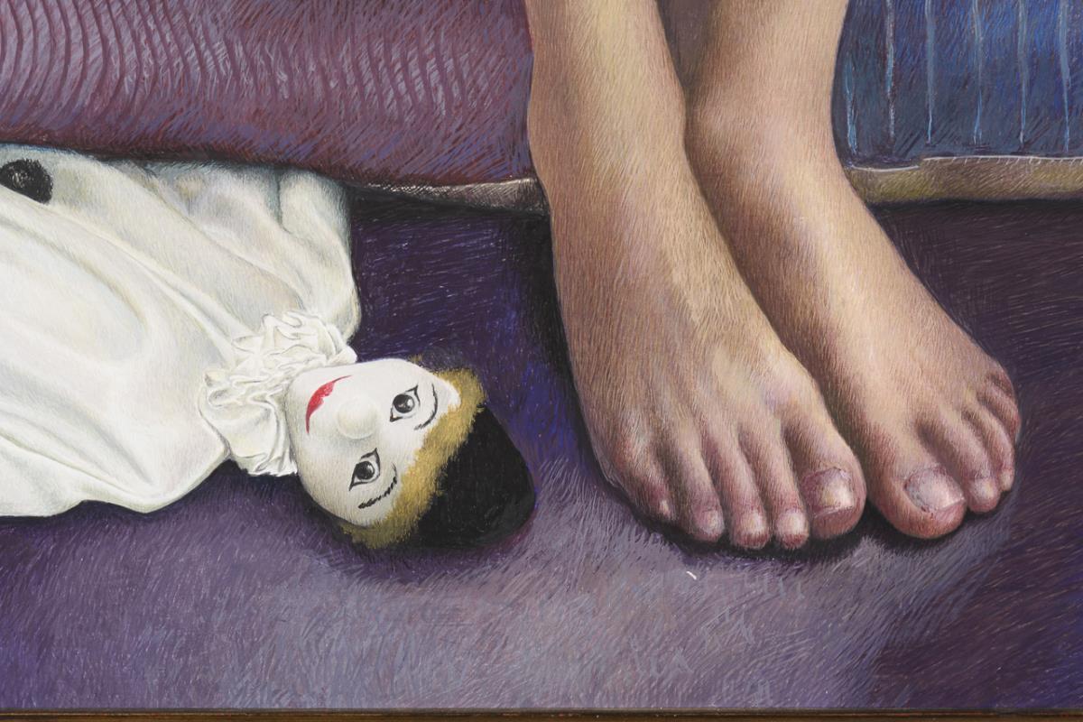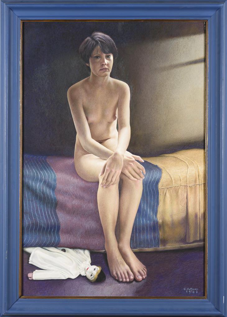 Mit nachdenklichem Blick auf dem Bett sitzende junge Frau mit einer Pierrotpuppe.