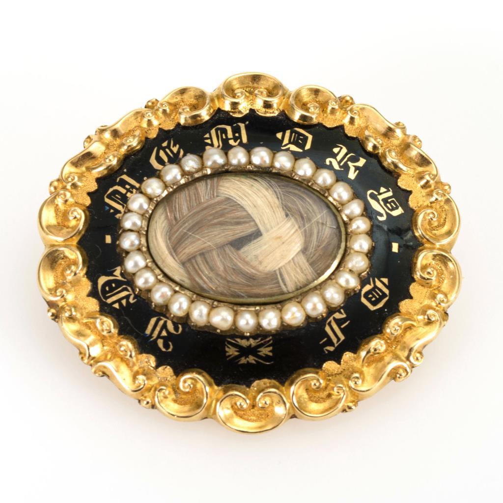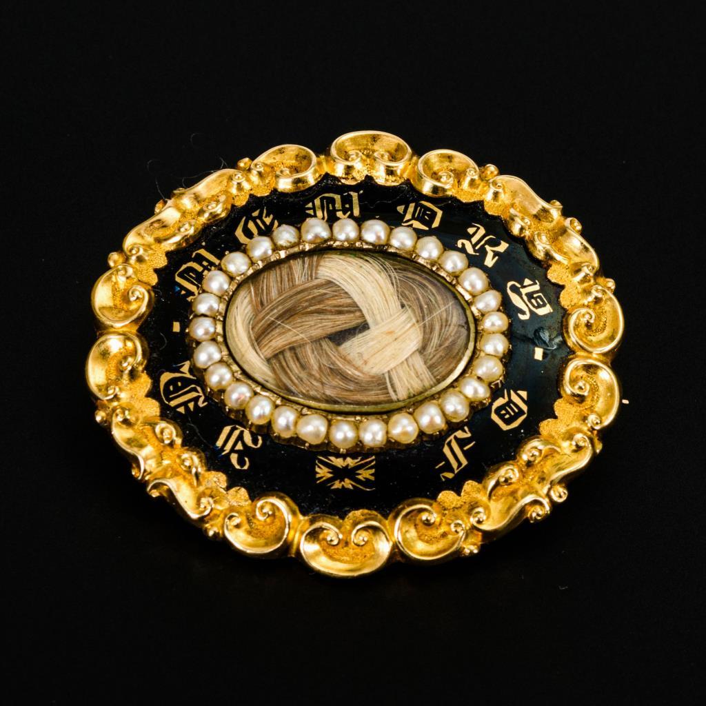 In Hohlform reliefierte, gefüllte Brosche mit verglaster Haareinlage, Perlchenumrandung und partiellem Schwarzemail. Hakenverschluss und kleine Öse.