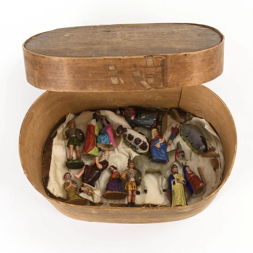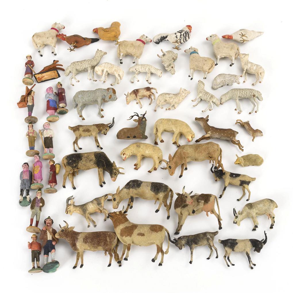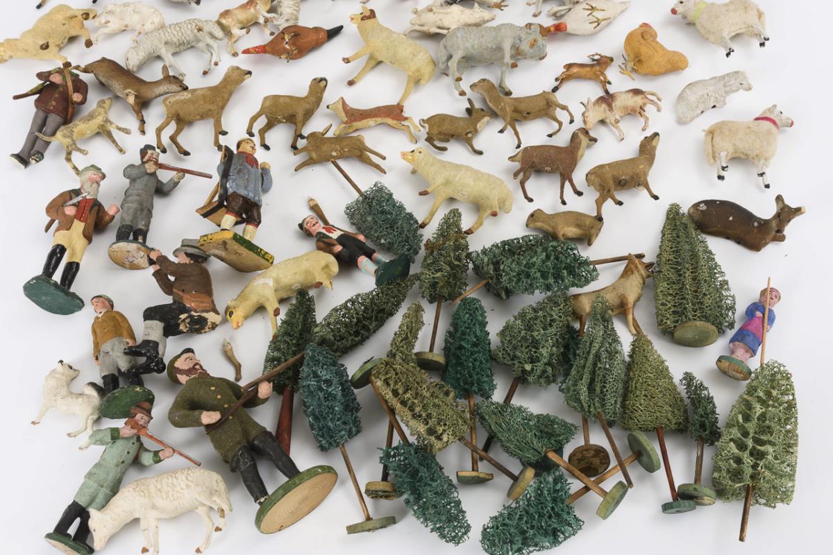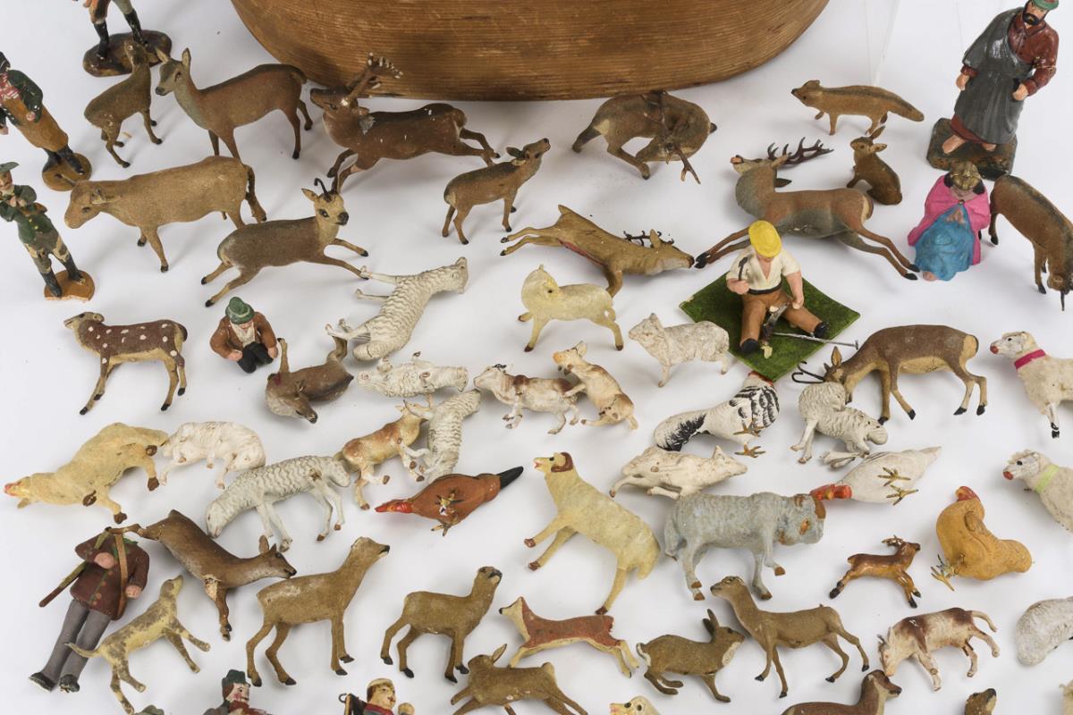 Zahlreiche Figuren (darunter Krippenfiguren), Tierfiguren (darunter Staubtiere, Wildtiere und Haustiere) und Bäume. Dazu große Spanschachtel (H 18 cm, L 40 cm). Mit Defekten.