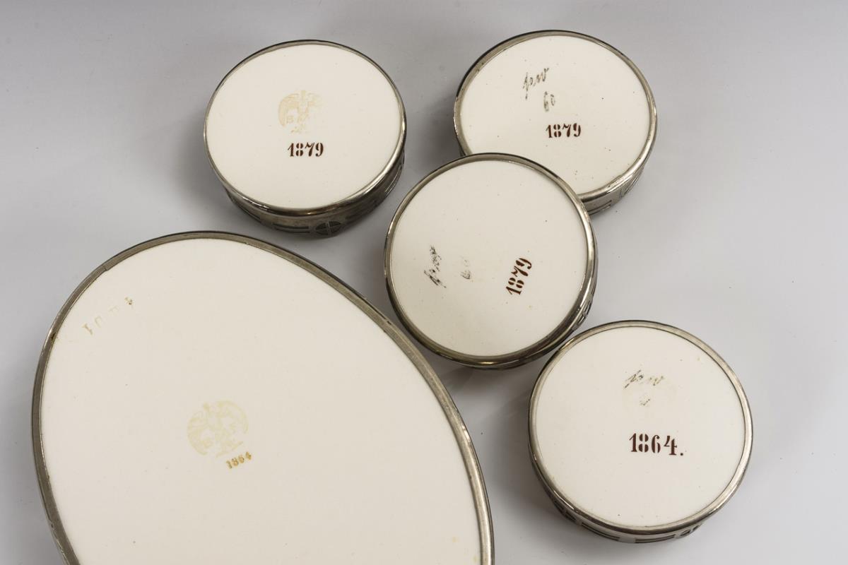Ovale Platte (L 20 cm) und 4 runde Untersetzer (Ø 8 cm) mit teils unterschiedlichem, geometrisiertem Dekor. Jeweils mit durchbrochenem Metallrand. Partiell leichte Gebrauchsspuren.