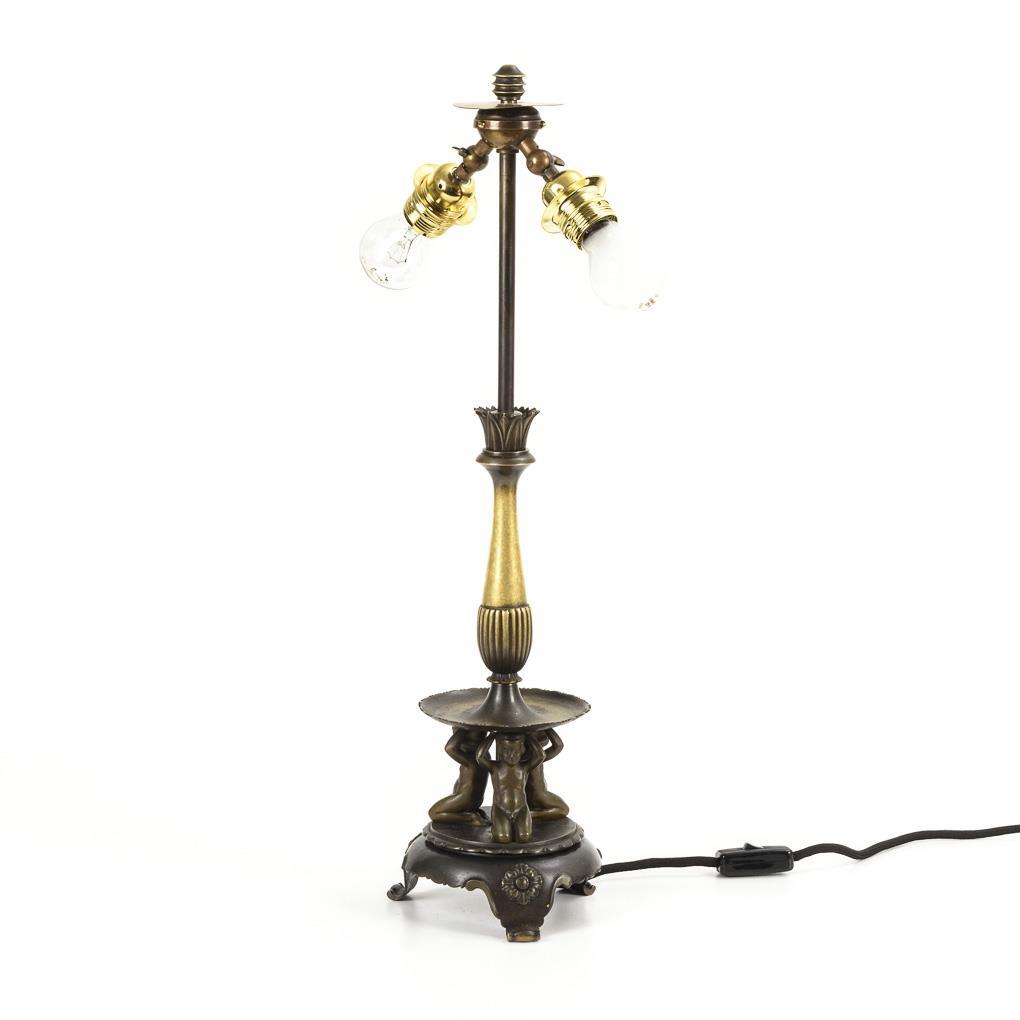 Gestufter Sockel mit 3 knienden Knaben, die die Sockelschale tragen. Funktioniert, Elektrik erneuert, ohne Schirm, Patina teils berieben.