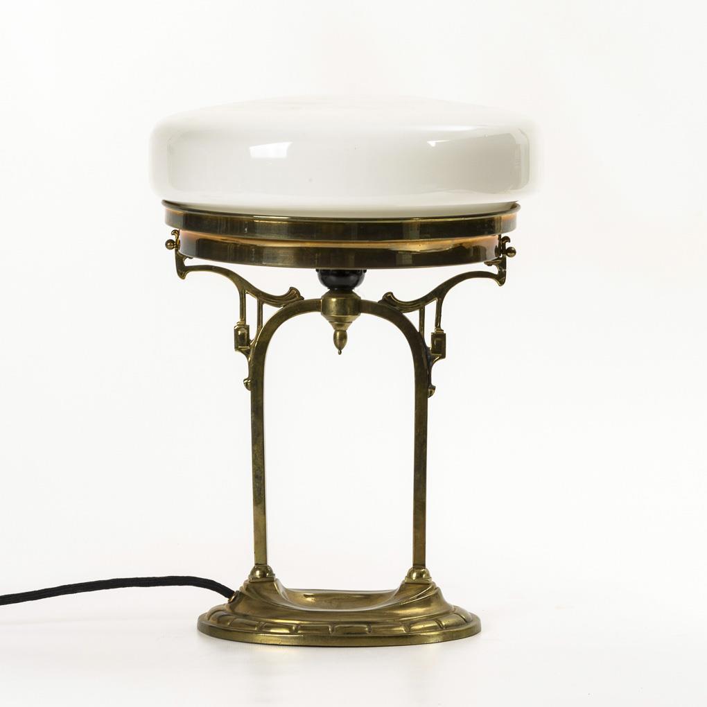 Jugendstil-Tischlampe mit weißem Glasschirm.