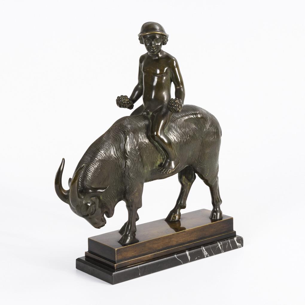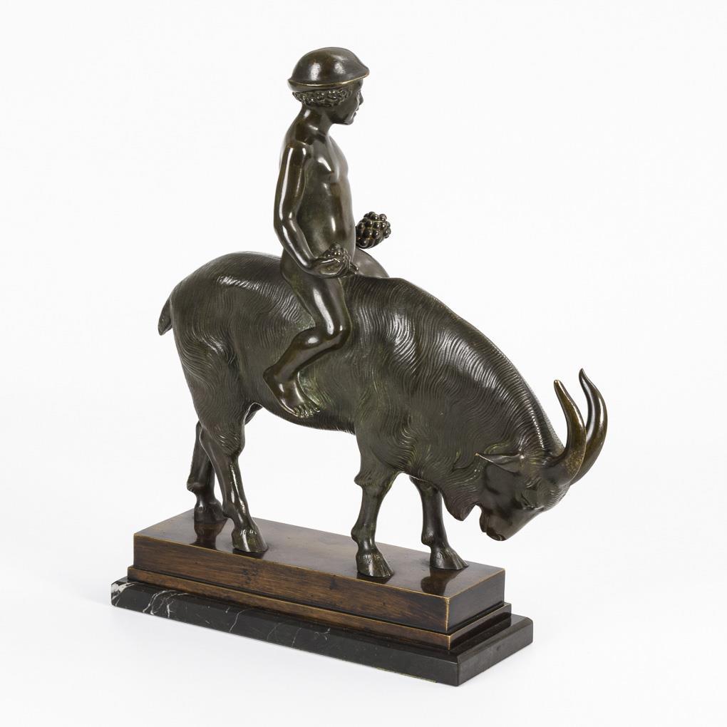 Nackt auf dem Ziegenbock reitender Knabe mit Trauben in den Händen. Patina etwas fleckig.