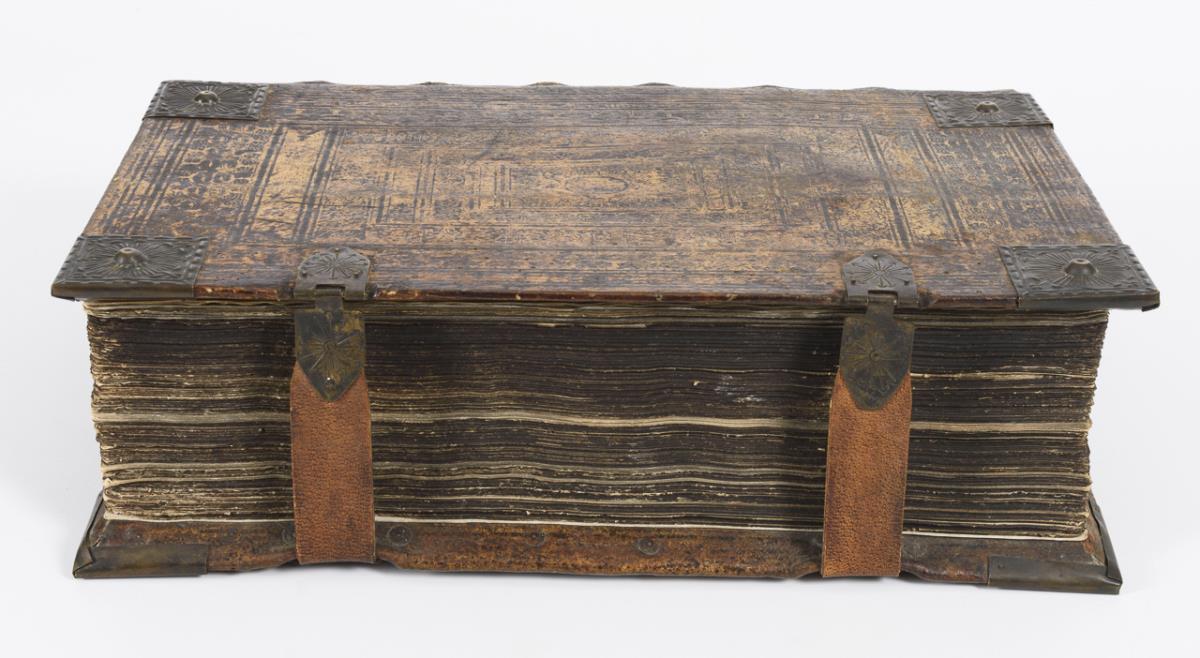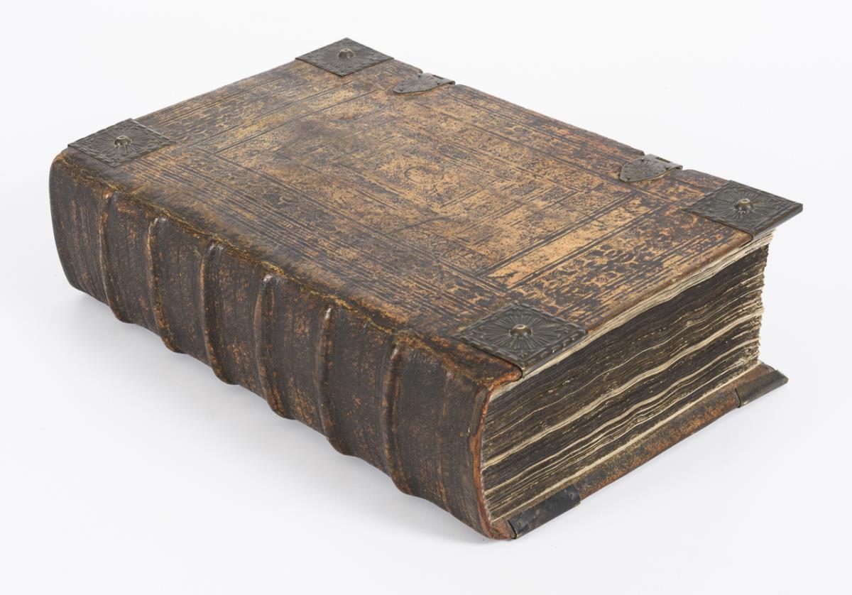Titelkupfer, Titelblatt, Luther Kupferstich, (64), 1181, (7) Seiten mit zahlreichen Illustrationen. Geprägter Ledereinband mit Metallecken und jünger ergänzten Schließen. Titelkupfer und Titelblatt mit ganzseitiger Hinterklebung und Randverlust, weitere Blätter mit ordentlich gemachten Randhinterklebungen. Register und die Bilder der Kurfürsten fehlen, sowie hinten die Augsburger Konfession.