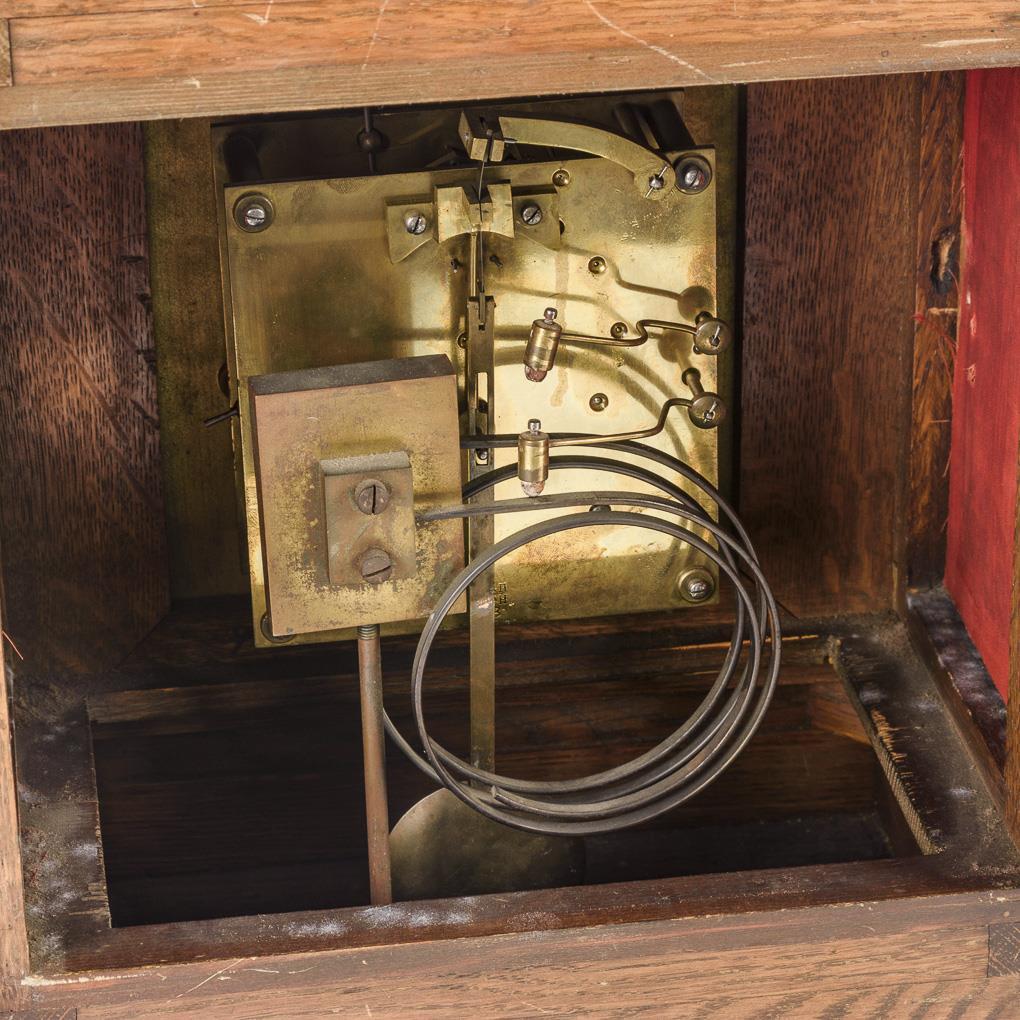 "W&H Sch. 3" gemarktes Werk mit Viertelstundenschlag auf 2 Tonfedern. Läuft, revisionsbedürftig. Messingfront mit versilbertem Zifferring mit römischen und arabischen Zahlen, Minutenkranz und Speerzeigern, in den Zwickeln Hilfsblätter für Regulation und Schlag, florale Bronze-Zierbeschläge.