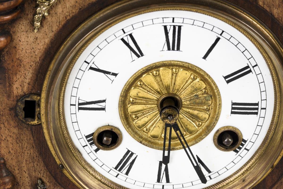 Gemarktes Werk mit Halbstundenschlag auf Rundgong. Läuft an, revisionsbedürftig. Weißes Emailzifferblatt mit römischen Zahlen, Minutenkranz und Stabzeigern.