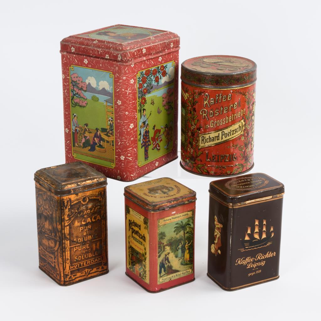 5x Teedosen mit Chinoiserie, 2x Richter-Kaffee, 2x Poetzsch-Kaffee, Cacao Rotterdam, Garbáty-Zigaretten. Alters-/Gebrauchsspuren.
