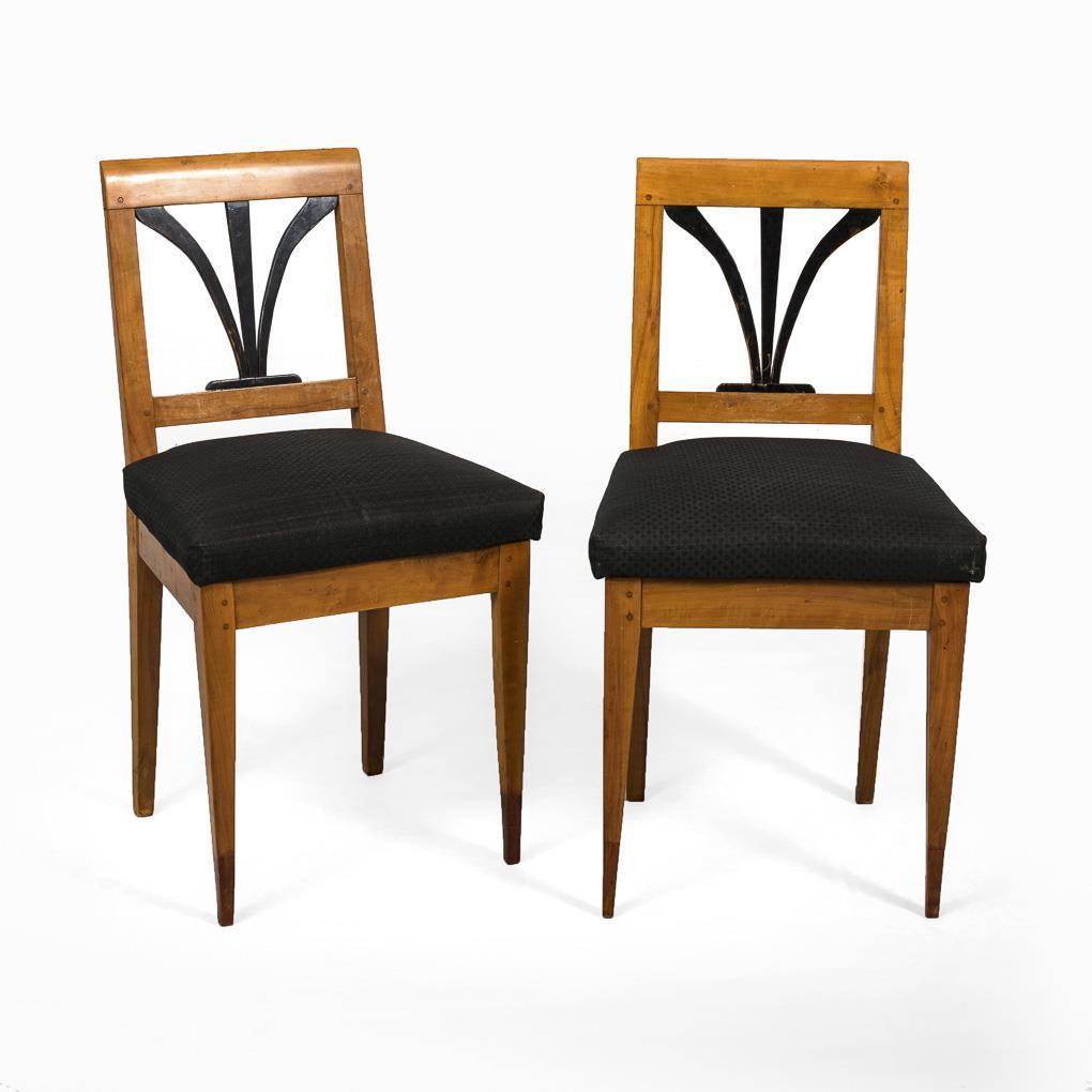 2 Polsterstühle mit ebonisierter Schilfblattversprossung, auf 4 Pfeilerbeinen; Polster mit schwarzem Bezug. Restauriert, Alters-/Gebrauchsspuren, Polster und Bezug ergänzt.