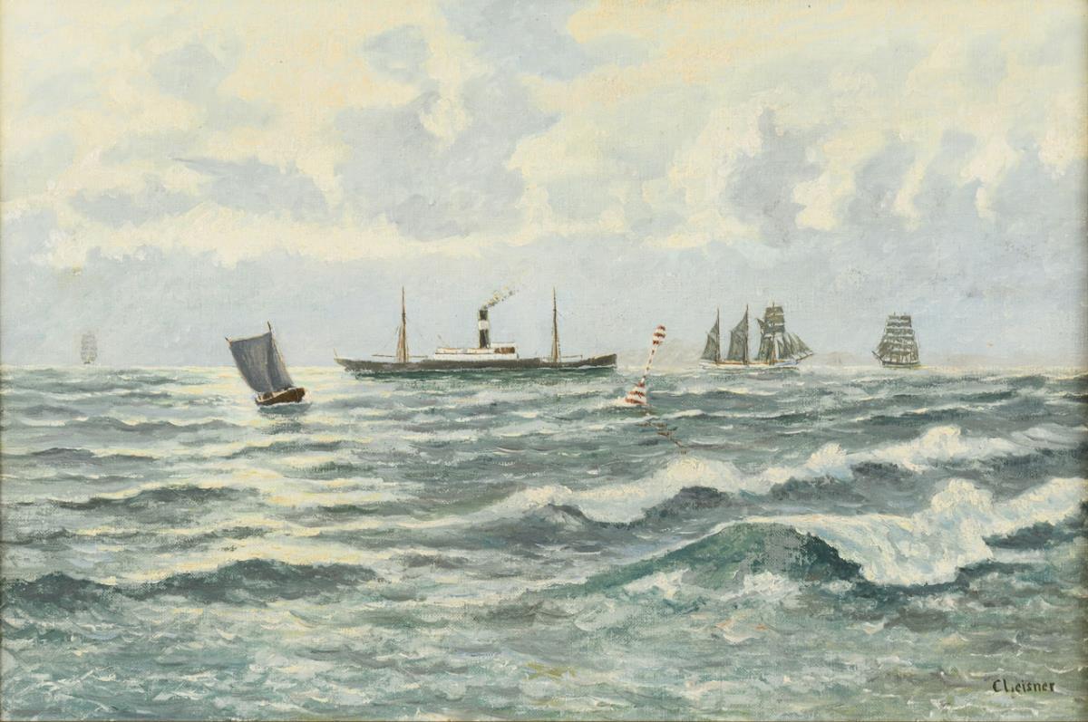 Blick vorbei an der Boje, den Seglern und dem Dampfschiff zum Horizont. Leichte Altersspuren.