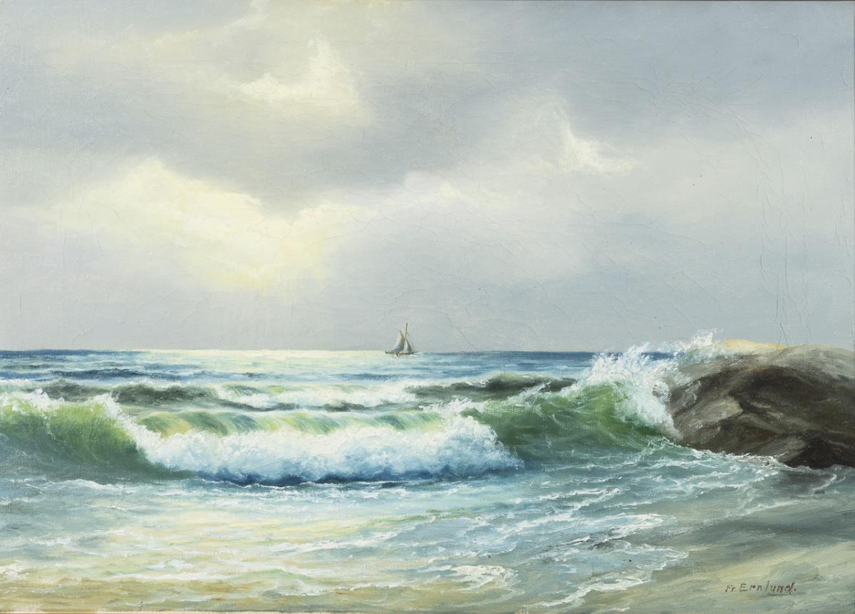 Stimmungsvolles Sonnenlicht über den Wellen des Strandes mit Blick zum Segelboot vor dem Horizont. Leichte Altersspuren.