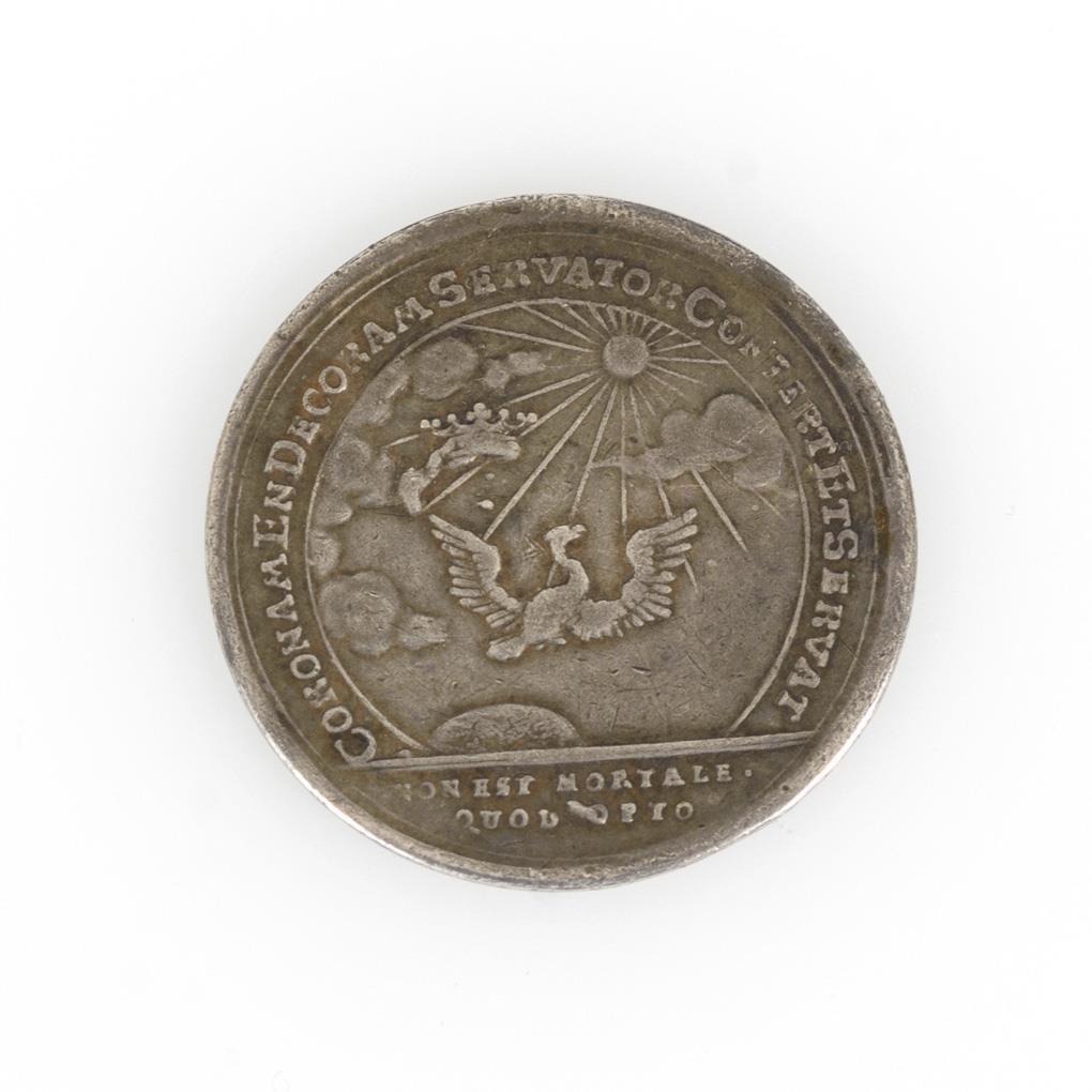 Auf den Tod von Christian Ernst - Christian Ernst, vor Wegekreuz mit Insignien kniend, im Hintergrund Saalfelder Stadtansicht. "Las Dir an meiner Gnade genugen", "Iesu du Sohn David erbarme dich mein". Revers: "Adler zu Sonne auffliegend, "Coronam en decoram servator confert er servat".