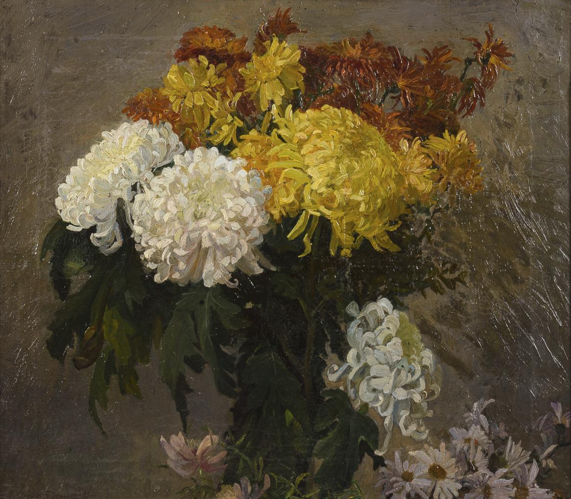 Chrysanthemen und Astern in einem imposanten Strauß vor neutralem Hintergrund. Minimale Altersspuren.
