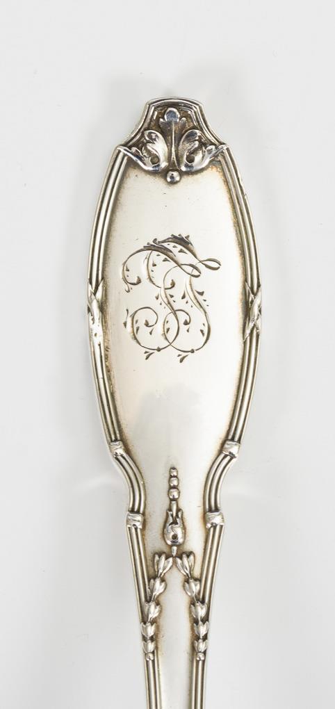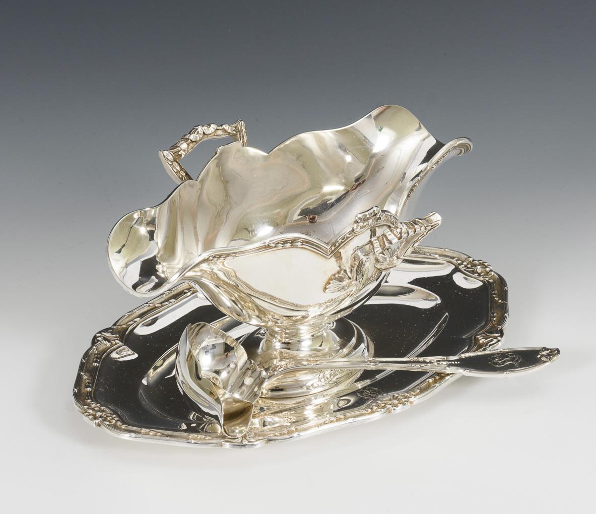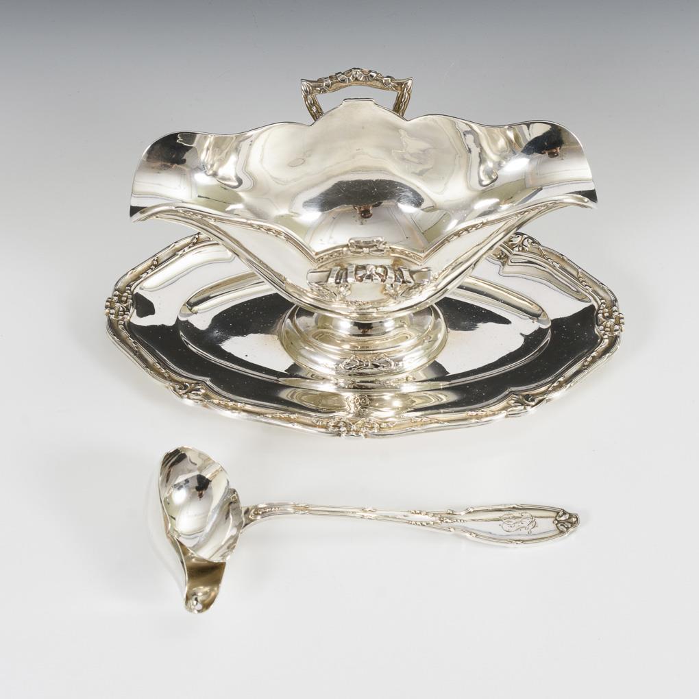 Sauciere mit fester Unterschale und Schleifenreliefs, dazu passend ergänzte Saucenkelle. Beide mit verschlungener Monogrammgravur "II".