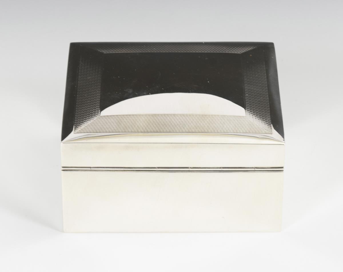 Quadratische Schatulle mit guillochiertem Scharnierdeckel. Innen mit Holz ausgekleidet. Einige kleine Dellen.