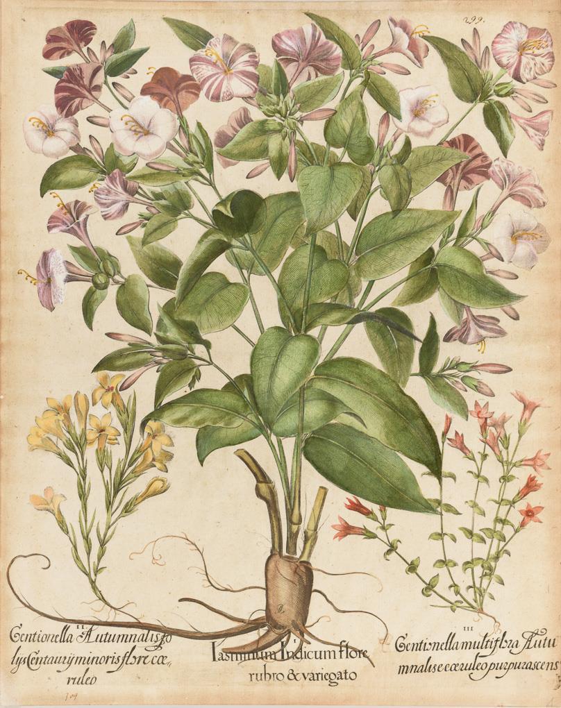 Detaillierte Pflanzendarstellungen von Enzian und Jasmin aus: Basilius Beslers "Hortus Eystettensis" ("Eichstätter Garten"). Kleiner Wasserschaden am unteren Rand, etwas griffspurig, kleines Loch unten links.