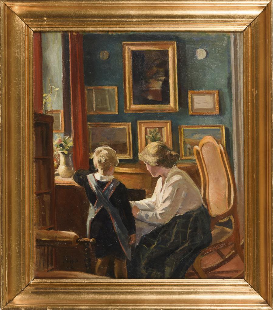 Mutter und Kind in der Stube nahe dem Fenster vor einer Wand mit Gemälden.