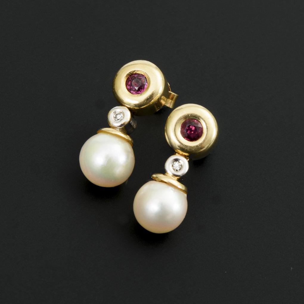 Ohrsteckerpaar mit Zuchtperle, Rubin und Diamant.