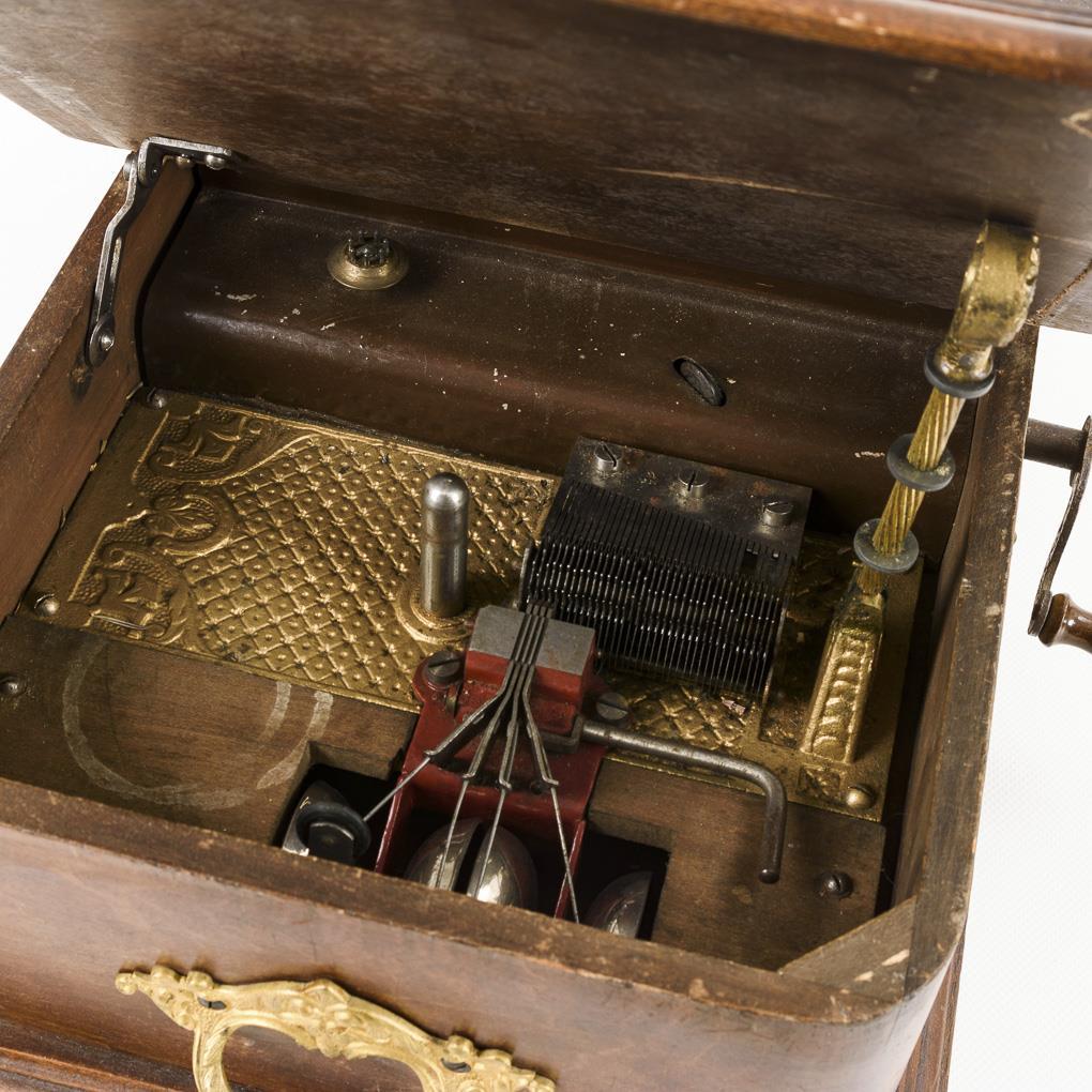 Kurbelaufzug und Zugschalter in der Front, ungemarktes Werk mit Sternrad am Zungenkamm (6,5 cm) über goldbronzierter Grundplatte, Zahnradantrieb sowie zuschaltbares Glockenspiel mit 4 Glocken. Aufsteckbarer Baumhalter bzw. versilberter Jugendstil-Tafelaufsatz. "Kalliope" gemarkte Blechplatten mit Zahnrand (Fledermaus-Walzer, Edelweiß-Lied, Stille Nacht usw.). Werk läuft. Kleinere Fehlstellen am Holz, einige Trockenrisse, 3 Kammzungen fehlen, Alters-/Gebrauchsspuren.