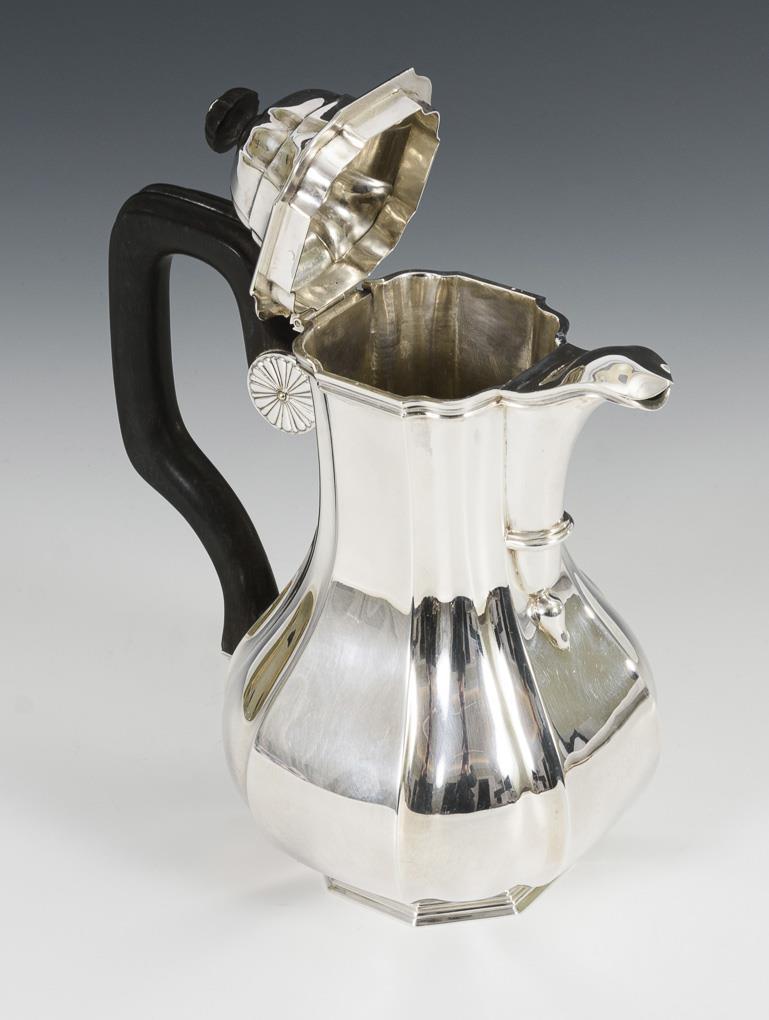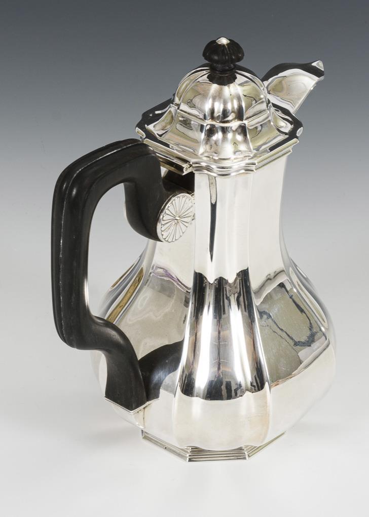 Bauchige Kanne mit Deckelknauf und Griff aus dunklem Edelholz.