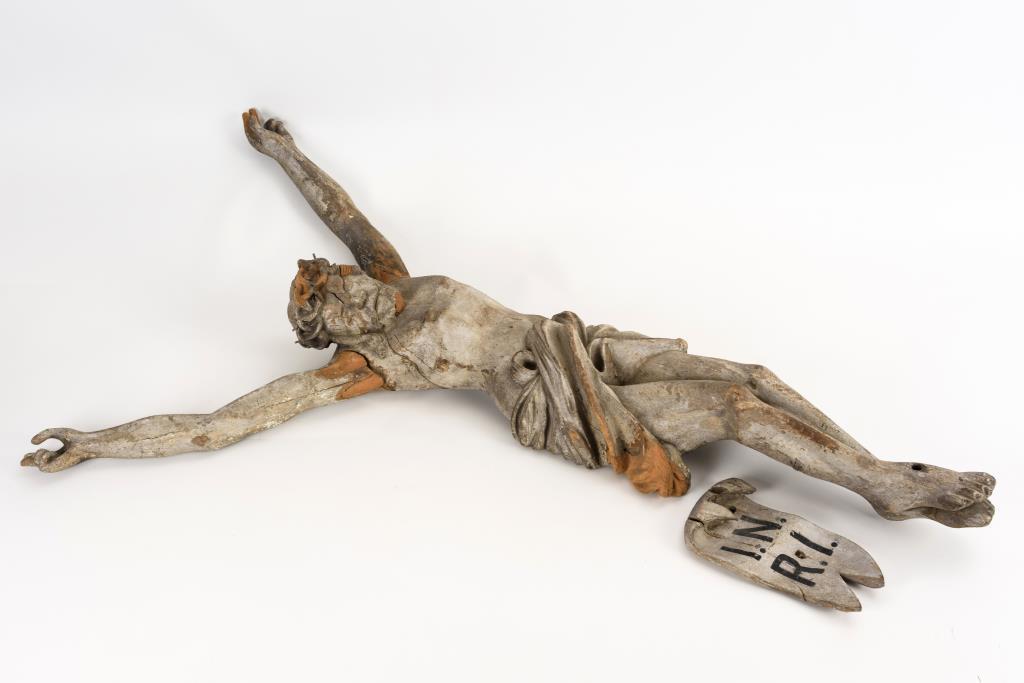 Christus mortuus im Dreinageltypus. Starke Alters-/ Gebrauchsspuren, einige Trockenrisse und Ergänzungen. Arme und Titulus lose anbei.