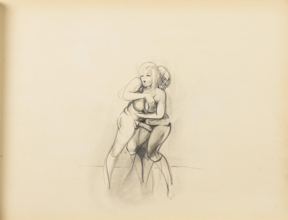 Skizzenblock mit 13 seltenen fetischistischen Zeichnungen, davon 6 aquarelliert. Dazu Publikation mit Widmung: Hans-Jürgen Döpp. Clitoria. Die surreale Erotik des Mister O. Passion 2011. Teils griffspurig und mit bestoßenen Rändern.