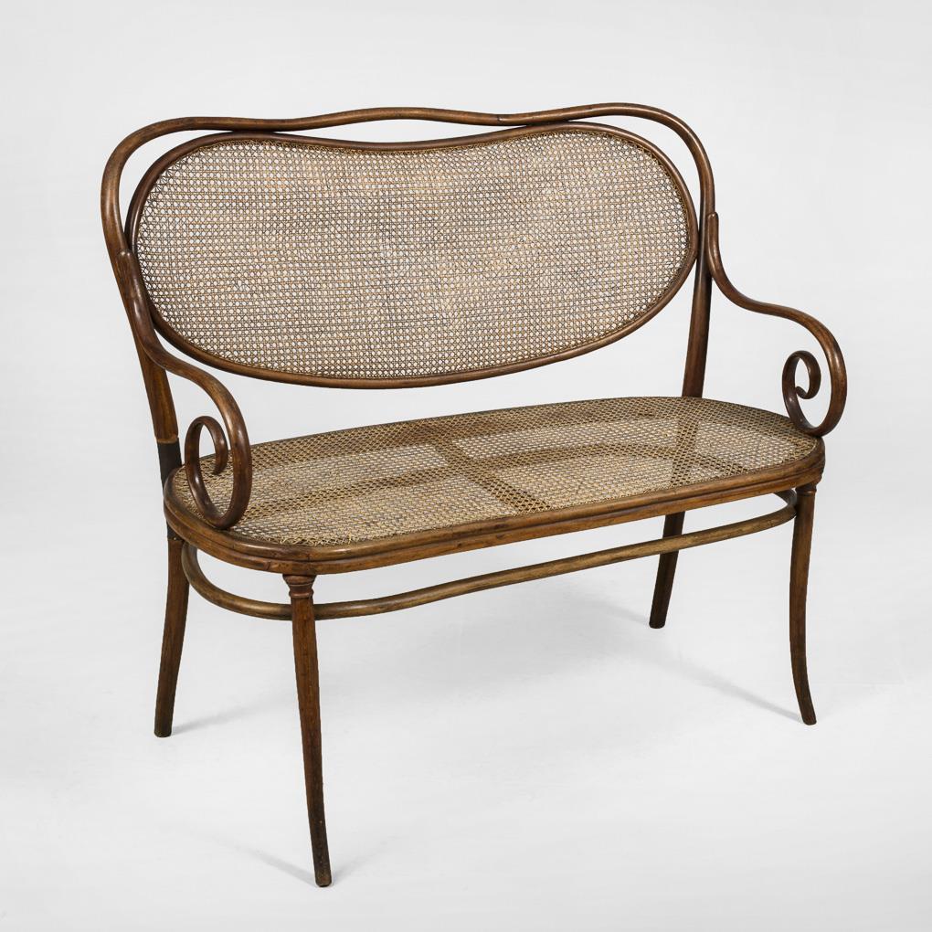 Grazile Sitzbank aus feinen gebogenen Leisten mit Rückenlehne und Sitzfläche aus Rohrgeflecht, Bugholz-Klassiker Nr. 2 auf dem Canapé-Modellblatt aus dem Musteralbum von 1883. Dieses Canapé diente als Requisite für erotische Fotoaufnahmen des bekannten DDR-Aktfotografen Günter Rössler (1926 - 2012) - Fotografie mit platziertem Modell als Beigabe. Alters-/Gebrauchsspuren, Geflecht restaurierungsbedürftig.