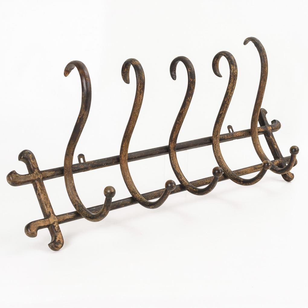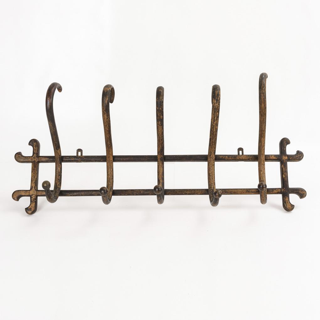 Ausladende Garderobenleiste mit 5 geschwungenen Bugholz-Haken, verso 2 Metallösen zur Befestigung an der Wand. Alters-/Gebrauchsspuren.