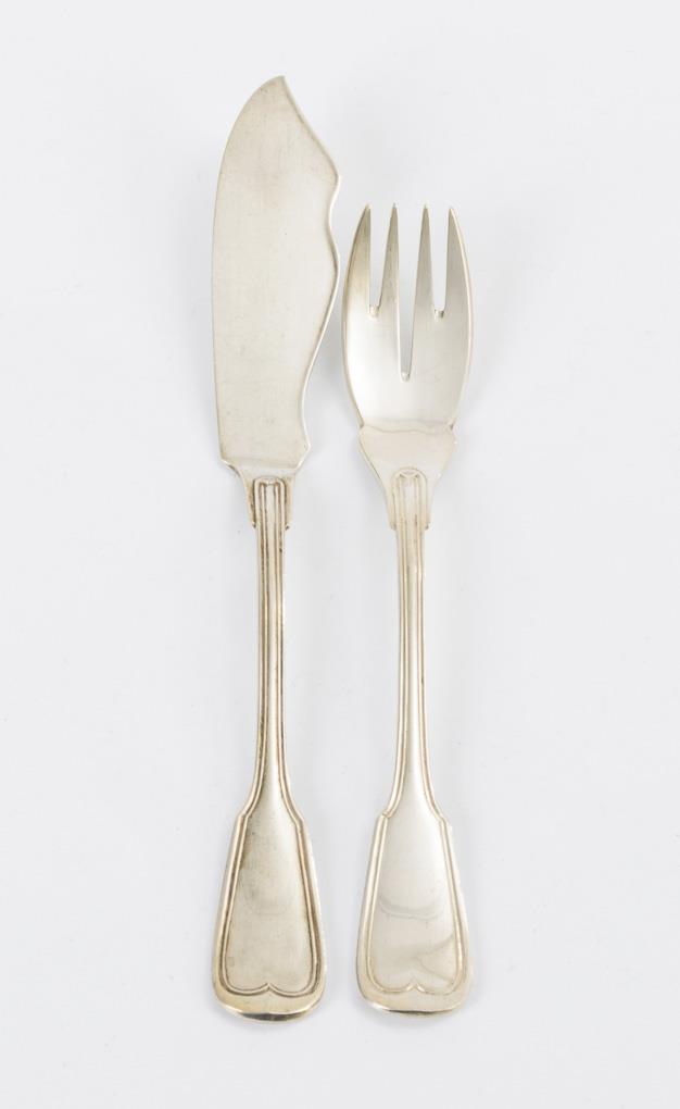 Fischbesteck mit Augsburger Faden, je 6 Messer und Gabeln. Leichte Gebrauchsspuren.