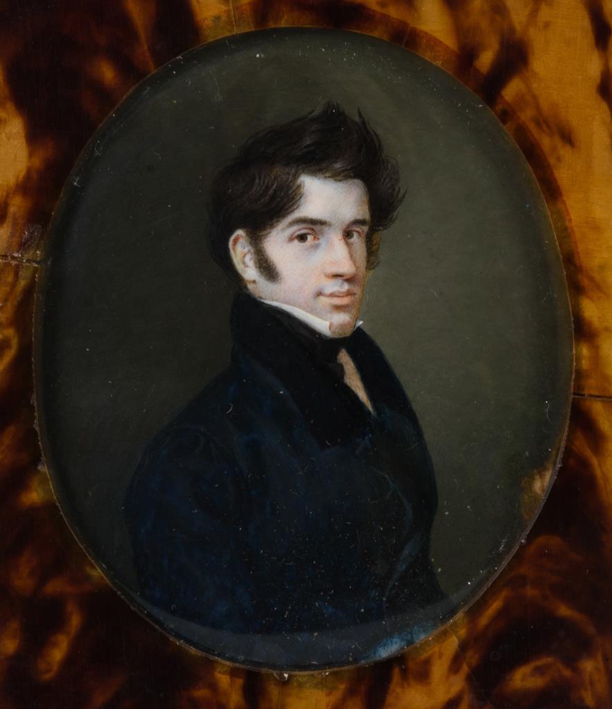 Hüftbildnis eines jungen Mannes in Biedermeier-Kleidung. Farbabrieb am Rand, Elfenbein und Schildpatt haarrissig, Appliken gelockert.