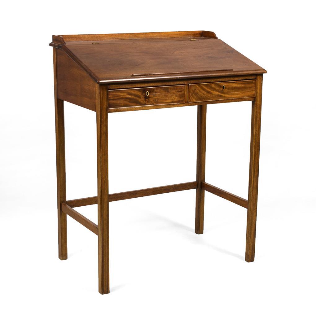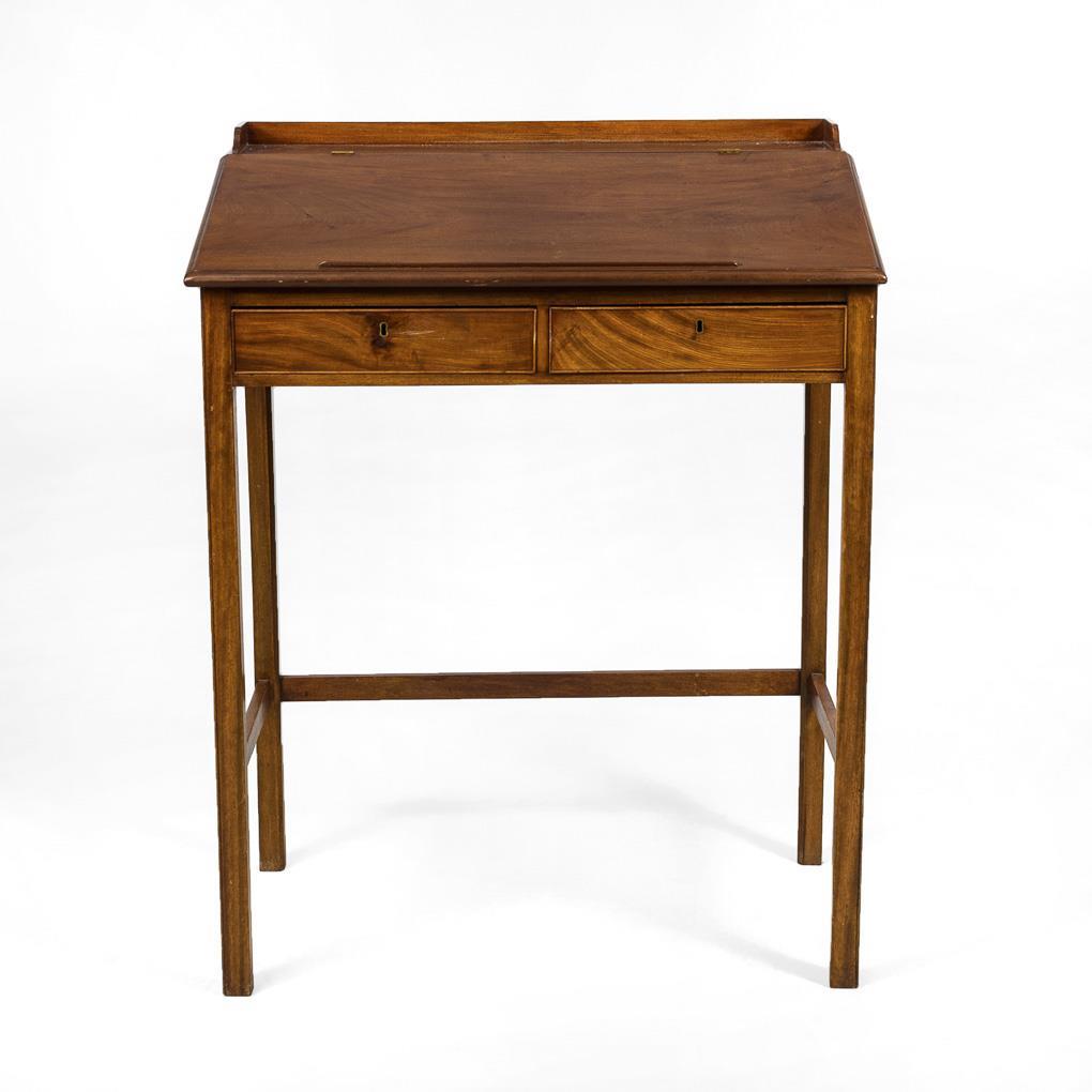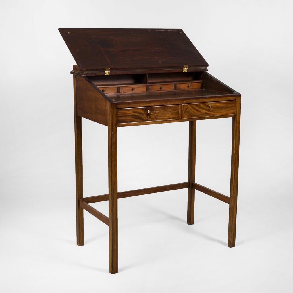 Schlichtes, aufklappbares Schreibpult mit 2 teils gefächerten Schüben; innen mit Ablagefläche und 4 kleinen Schüben. Ohne Schlüssel. Restauriert, Alters-/Gebrauchsspuren.