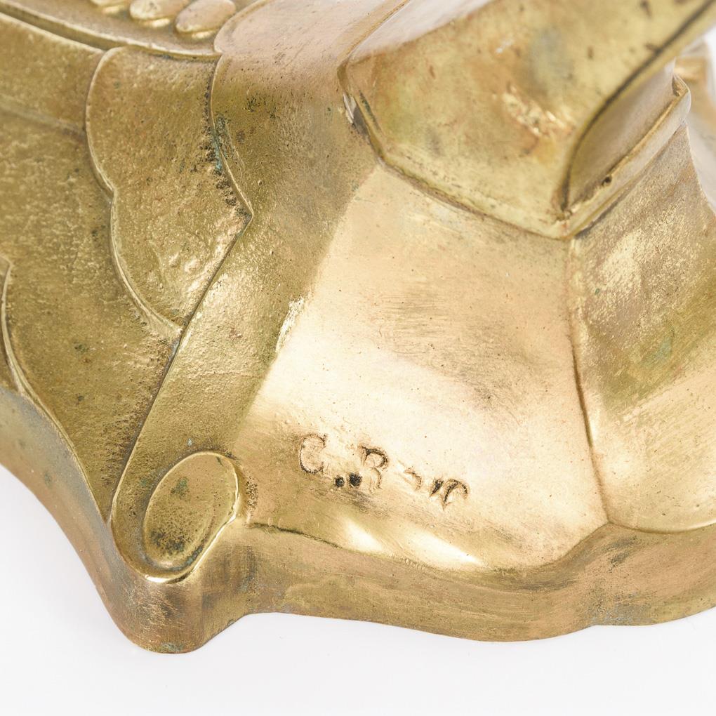 Glockenschirm (H 12 cm), eingehängt in einen gebogten Lampenarm in Form eines Greifvogels, geometrisch reliefierter Fuß. Elektrifiziert (Funktion nicht geprüft).