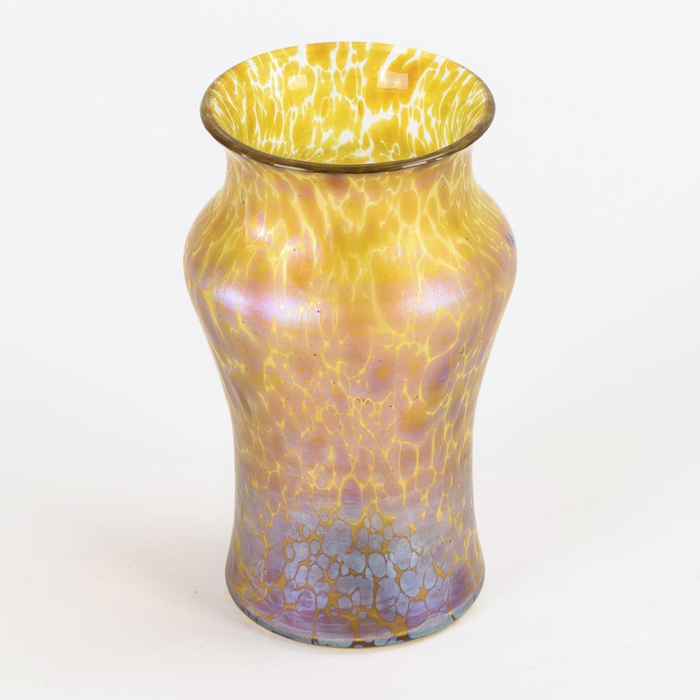 Farbloses Glas mit silbergelben Kröselaufschmelzungen, irisiert. H 14 cm.