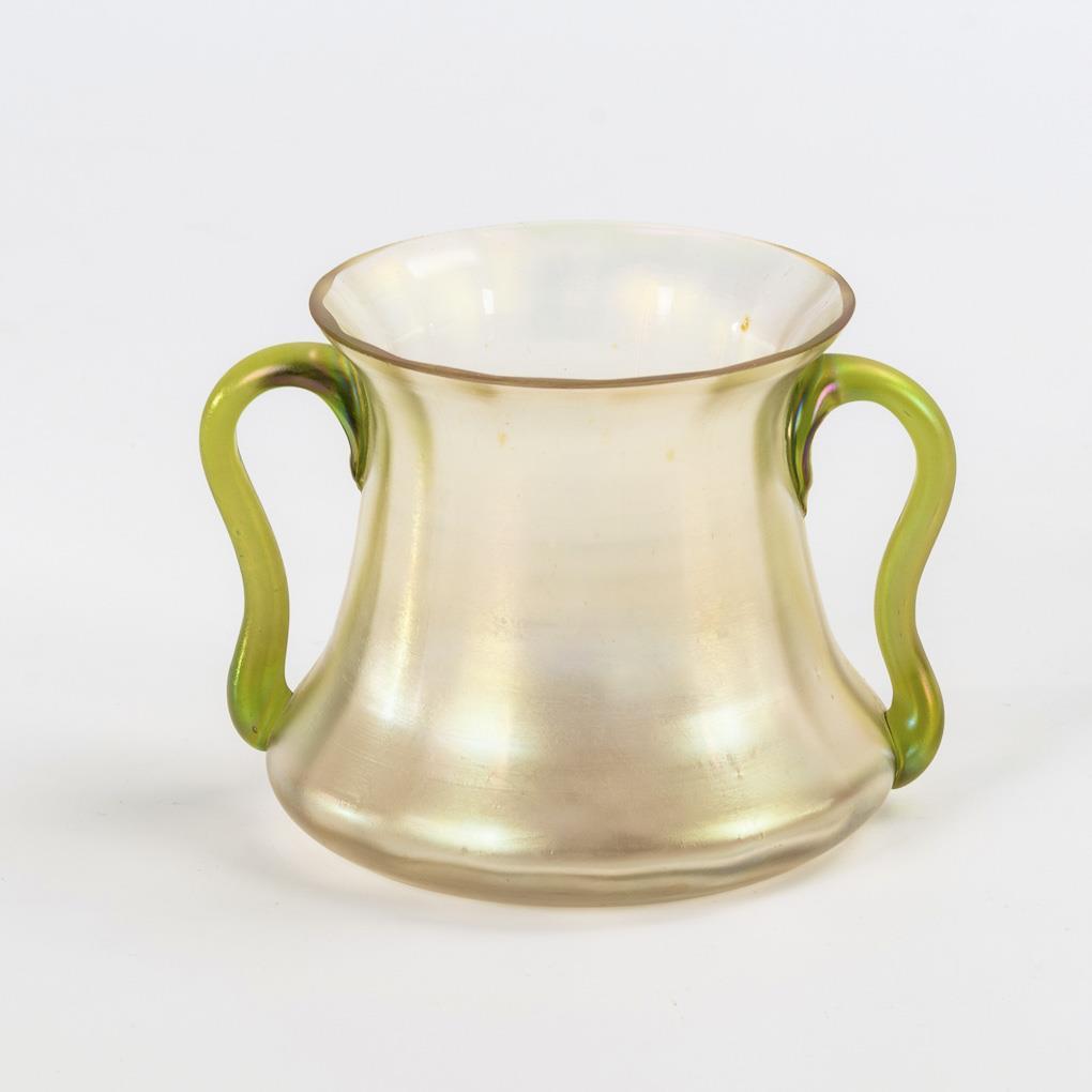 Konvexes, längsoptisch formgeblasenes Glas mit zwei grünen Henkeln. Minimale Bestoßung am Mündungsrand.