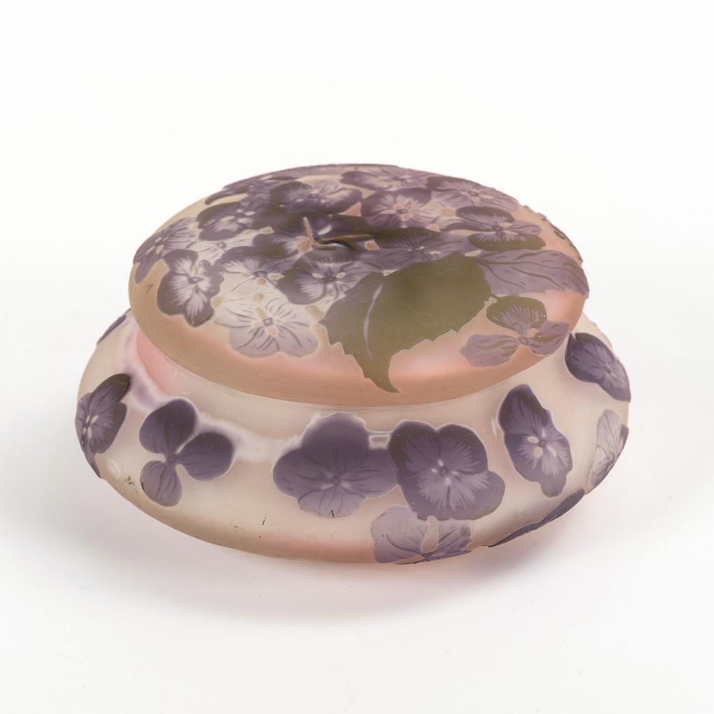 Gedrückt gebauchte Dose. Umlaufend und auf dem Deckel geätzte Hortensienblüten.