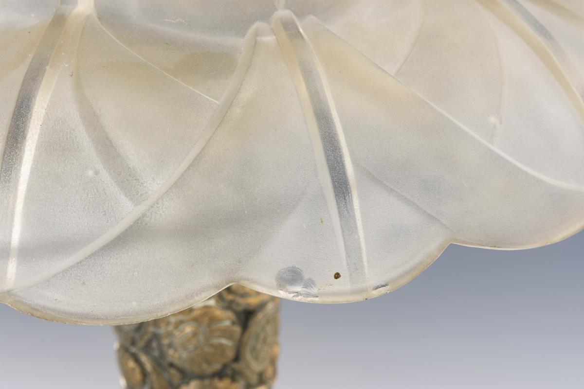 Farbloses, formgepresstes und mattiertes Glas, vernickelte Bronze. H 52,5 cm.