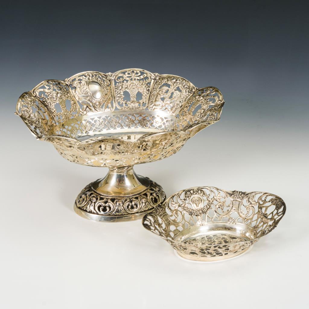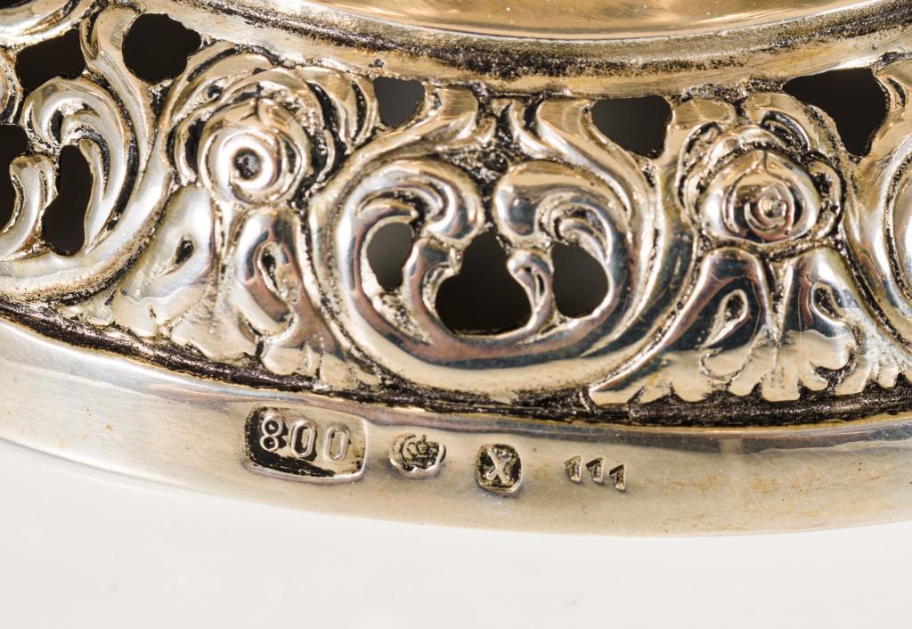 Fußschale Silber, Schälchen versilbert.H 4,5/13,5 cm, L 17/24,5 cm.478 g.