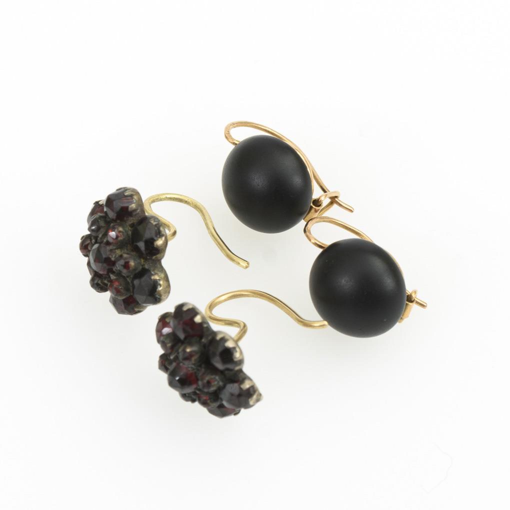 2 Ohrhängerpaare mit Granaten und Gagat?.