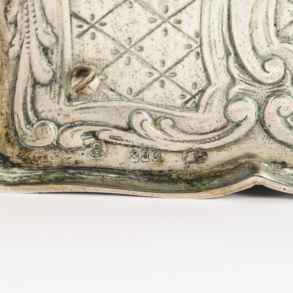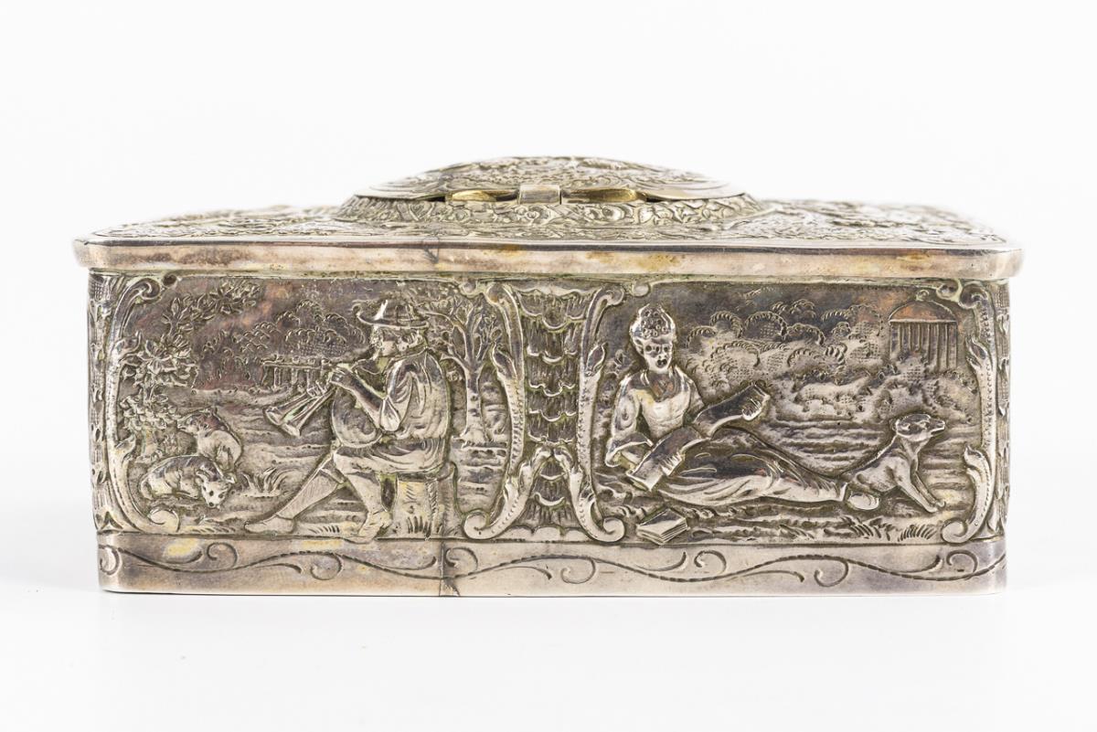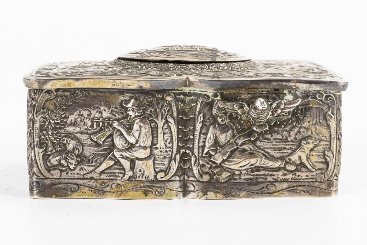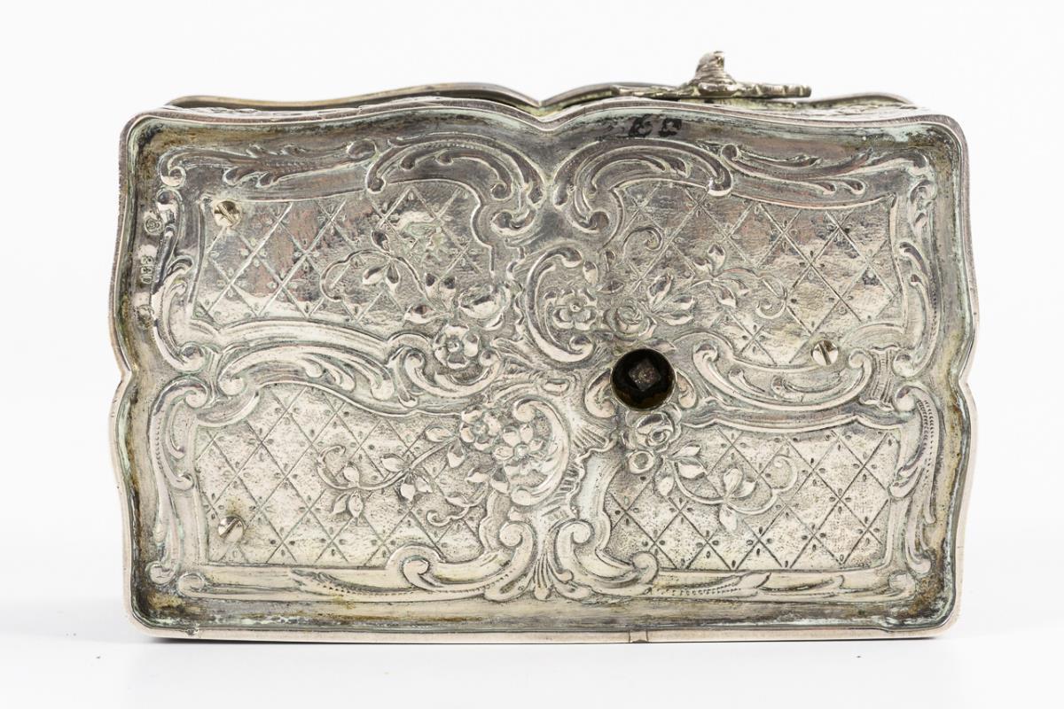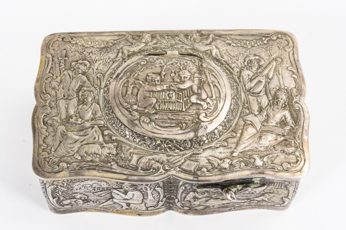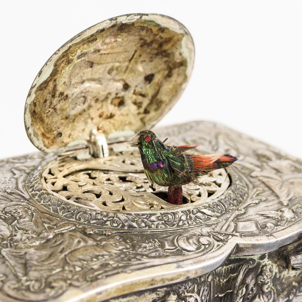 Allseits im Barock-Stil mit bukolischen Szenen, Eroten und Ornament reich reliefierte Dose. Nach dem Auslösen des vogelförmigen Schiebereglers klappt der Scharnierdeckel auf und gibt den kleinen Vogel mit farbigem Federkleid frei, der zum Gezwitscher entsprechend den Schnabel, die Flügel und den Schwanz bewegt. Intakt, Vogel-Singstimme wird durch Schleifgeräusch des Spielwerks begleitet (überholungsbedürftig), Schlüssel ergänzt.