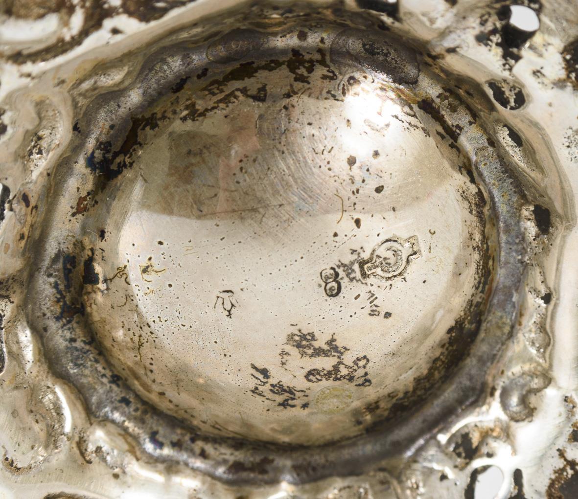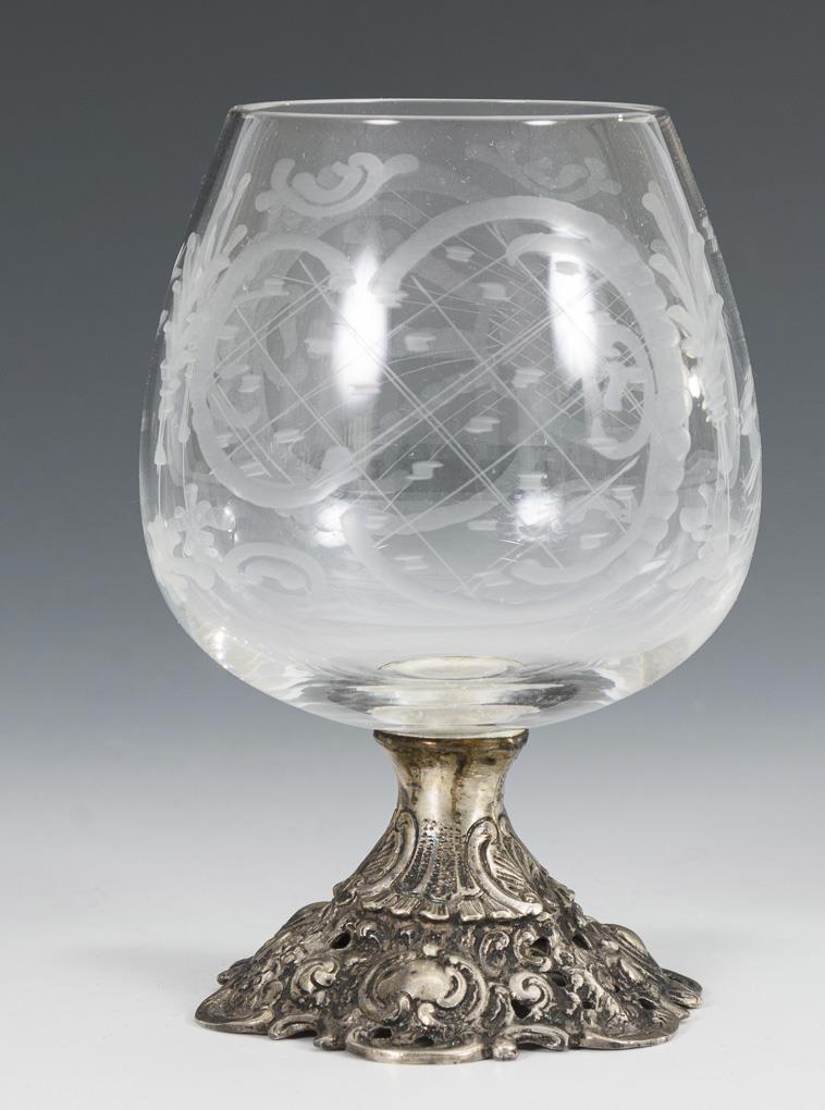 Beschliffene Kuppa mit Rocaillenzier, auf durchbrochen gearbeitetem Silberfuß.