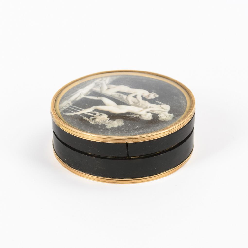 Runde Tabatiere; auf dem Passdeckel Miniatur mit 2 nackten Frauen an der Hyftherme. 1 Riss im Deckel, Alters-/Gebrauchsspuren.