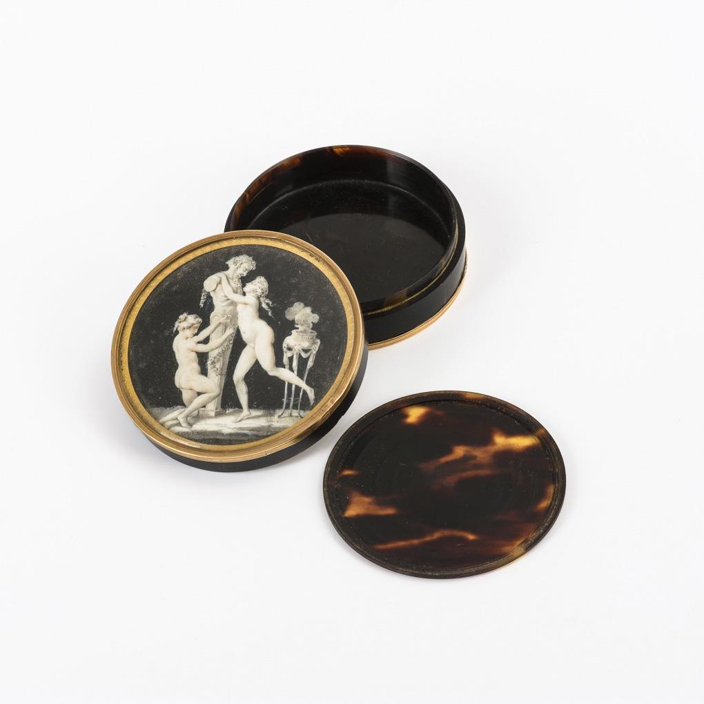 Schildpatt, Goldmontierung, verglaste Miniatur (Tempera/Elfenbein?). H 2,5 cm, Ø 7 cm.
