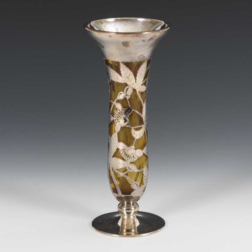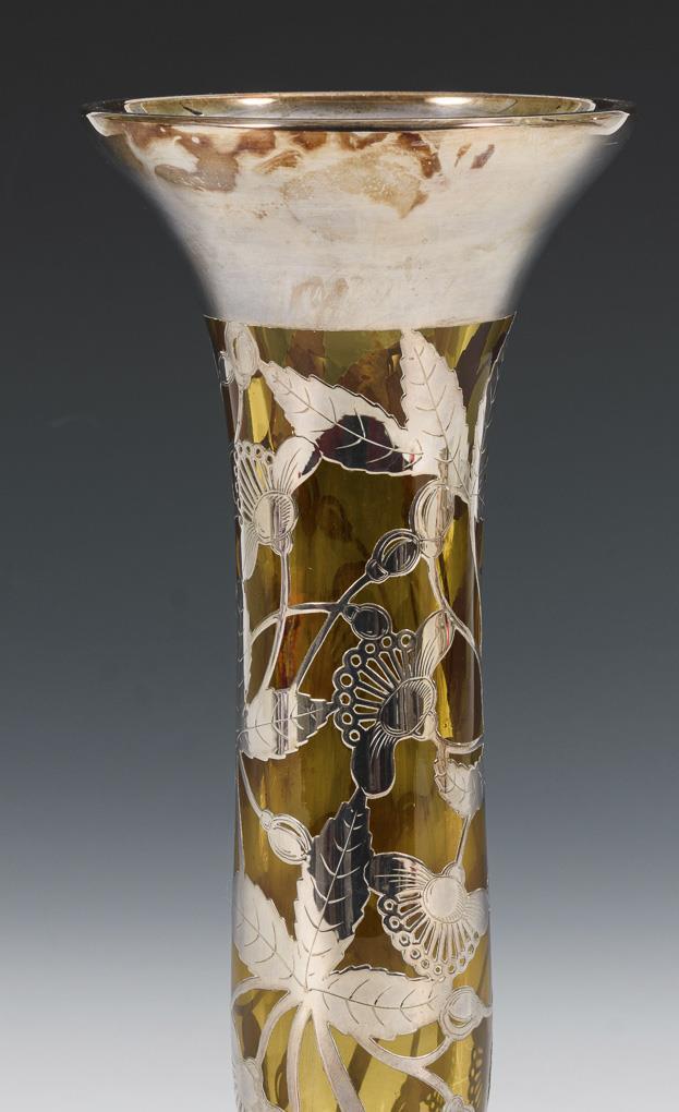 Schlanke Vase aus gelblichem Glas mit floraler Silberauflage. Gebrauchsspuren.