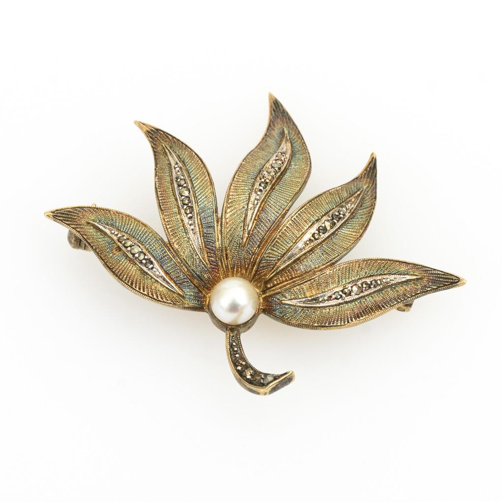 Blattbrosche mit Zuchtperle. Theodor Fahrner.